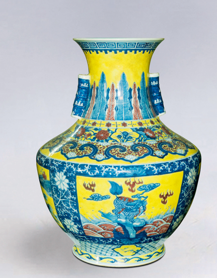 LOT:159 乾隆款青花黄地五彩耳瓶